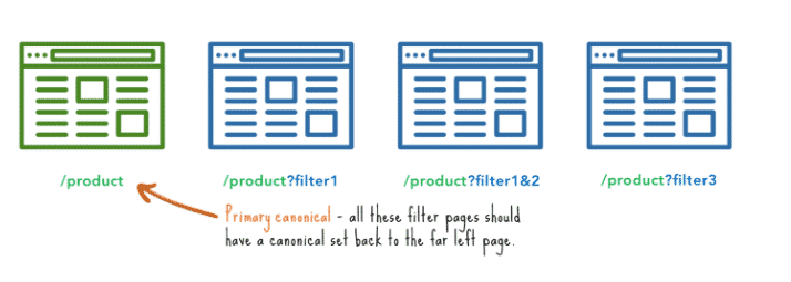Dans cet exemple, l’URL 1 est l’URL canonique, c’est-à-dire l’URL principal. Autrement dit, la Page 1 est la page de référence. La Page 2 n’est qu’une variante ou un pur duplicate de la Page 1. Cette technique est quasiment incontournable dans le ecommerce au niveau des pages catégories, des pages produits et de la pagination. Ces balises sont parfois générés automatiquement par le CMS, mais ce n’est pas toujours le cas.