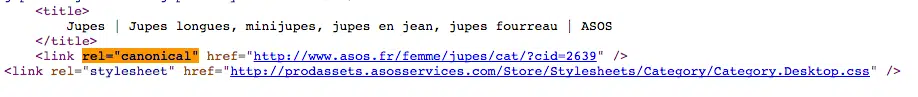 Le problème, c’est que ces systèmes de filtres et d’affichage génèrent automatiquement des pages très similaires avec chacune une URL propre. Ce qui créé du duplicate content, car la page catégorie sans filtre contient forcément les produits qui apparaissent sur les pages créées par les filtres. Vous devez donc utiliser des balises canoniques pour indiquer à Google que toutes les pages appartiennent à la même page catégorie. C’est justement ce qu’Asos a fait, comme l’indique le code source de leur page « Jupe » :