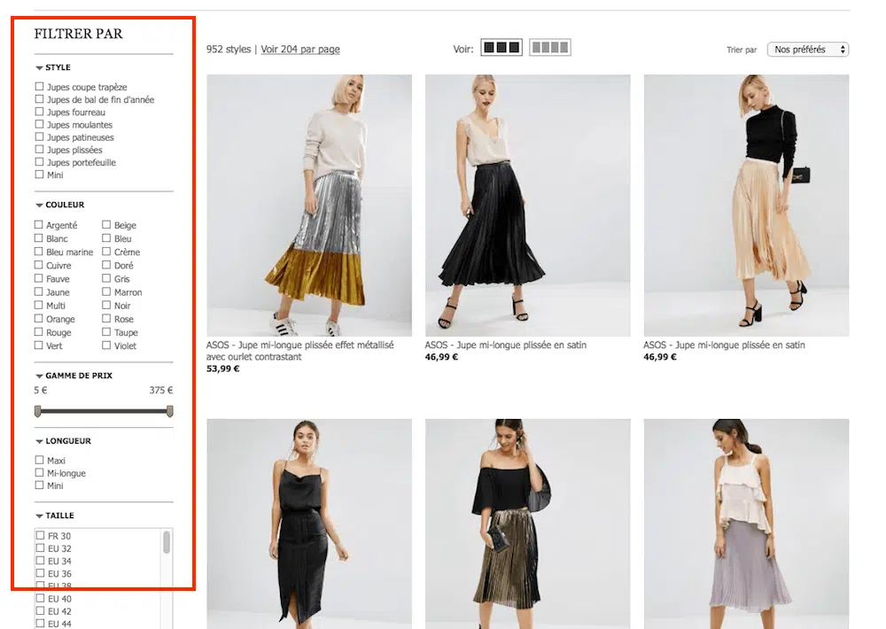 Commençons par les pages catégories. Une page catégorie contient en général des filtres qui permettent au visiteur de trouver plus rapidement et plus facilement le produit qu’il recherche (exemple Asos) :