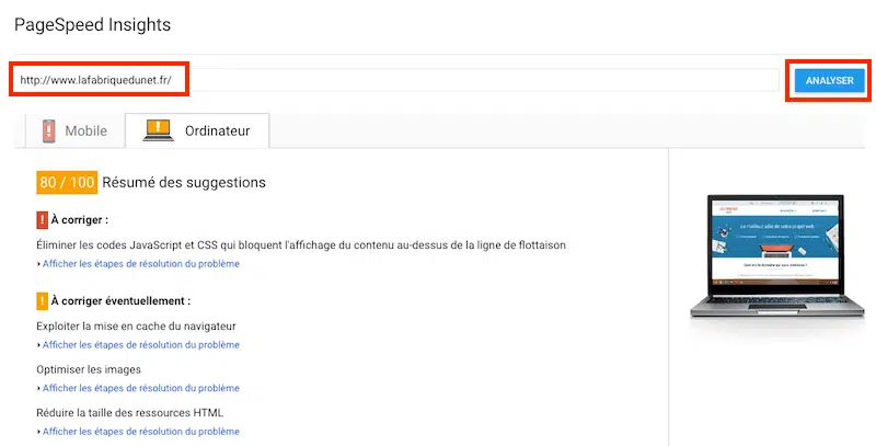 Il est donc dans votre intérêt d’optimiser la vitesse de chargement de votre site ecommerce. Pour commencer, vous devez mesurer le temps de chargement de votre site. Pour cela, plusieurs outils sont à votre disposition : Google PageSpeed Insights, GTMetrix ou Pingdom. Le fonctionnement de ces outils est assez similaire : vous entrez l’URL de votre nom de domaine, l’outil analyse en quelques secondes le site avant de vous attribuer un score de performance et de vous montrer plusieurs métriques très intéressantes concernant votre site. L’outil Google vous donne en plus des recommandations personnalisées pour améliorer la vitesse de votre site ecommerce.