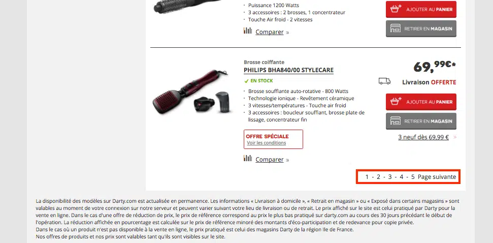 Dans le ecommerce, beaucoup de pages sont paginées. C’est le cas par exemple des pages catégories. Lorsque le catalogue est trop important et pour ne pas produire des pages interminables, un système d’ancres numérotées est utilisé en bas de la page (exemple Darty) :
