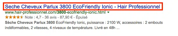 - Attirer l’attention des internautes qui recherchent des produits sur Google (ou sur un autre moteur de recherche). Votre titre doit indiquer le nom du produit et donner envie de cliquer sur votre lien (en mettant en avant une caractéristique forte du produit ou en utilisant un incentive). Il doit être à la fois descriptif et incitatif.