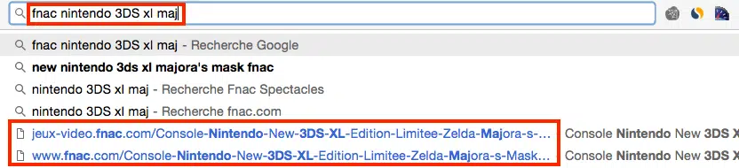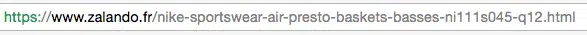 La plupart des CMS modernes proposent désormais par défaut des URL « SEO-friendly », mais il reste important de vérifier et de personnaliser la structure de vos URL pour garantir leur lisibilité. Du type « www.votre-marque.fr/product_id4436574?colour=green&type=shirt ». Ces URL n’ont aucunes significations pour les internautes. Par ailleurs, avec une URL de ce type il est difficile de retourner sur la page depuis la barre de recherche du navigateur. Tandis que si vous utilisez des URL simples et compréhensibles, l’internaute sera invité à retourner sur votre page en tapant le début du nom du produit dans la barre de recherche du navigateur :