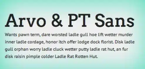 Arvo est l’une des rares polices à empattements épais (slab serif) de la bibliothèque Google Fonts. C’est sans doute la plus intéressante. La plupart des caractères ont un bon rendu, sauf peut être le « S » qui est un peu maladroit. Nous avons combiné Arvo avec PT Sans, avec ses beaux arrondis et son caractère « convivial ». Il y a plusieurs variantes de PT Sans. La version « plain » est la plus adaptée pour les corps de contenus.