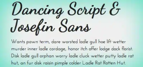 Les polices scripts (écriture manuscrite) sont souvent difficiles à intégrer, surtout lorsqu’elles sont légères et fines (à la différence de Lobster). Pour cette raison, Dancing Script n’est probablement pas la meilleure des polices de la bibliothèque Google Fonts, mais c’est à notre avis la meilleure dans sa catégorie (scripts fonts). Dancing Script, à la différence de Lobster, est une police que l’on pourrait qualifier de « féminine ». C’est pourquoi nous avons décidé de la coupler avec Josefin, une police très fine sans-serif qui donne une unité à la combinaison. Cette combinaison est surtout adaptée pour les sites qui ont une cible plutôt féminine.