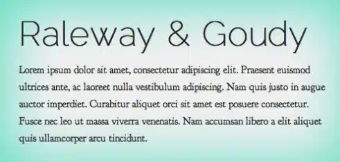 La police Raleway est très belle, mais ce type de police très fine pose des problèmes de lisibilité. D’où l’importance d’utiliser Raleway pour les titres ou vos textes en gros caractères. Nous avons trouvé intéressant de la combiner avec Goudy Bookletter 1911, qui utilise un style orné et ancien. Toutefois, pour des projets actuels, il peut être pertinent d’explorer des combinaisons avec des polices comme Merriweather, Playfair Display ou Lora, qui sont très appréciées pour leur élégance et leur lisibilité. Mais attention, cette dernière police doit aussi être utilisée avec précaution. Evitez de l’utiliser si vous publiez de longs textes – des articles de blog par exemple. Elle fatigue les yeux assez rapidement. En clair, cette combinaison convient si vous avez peu de textes sur votre site.