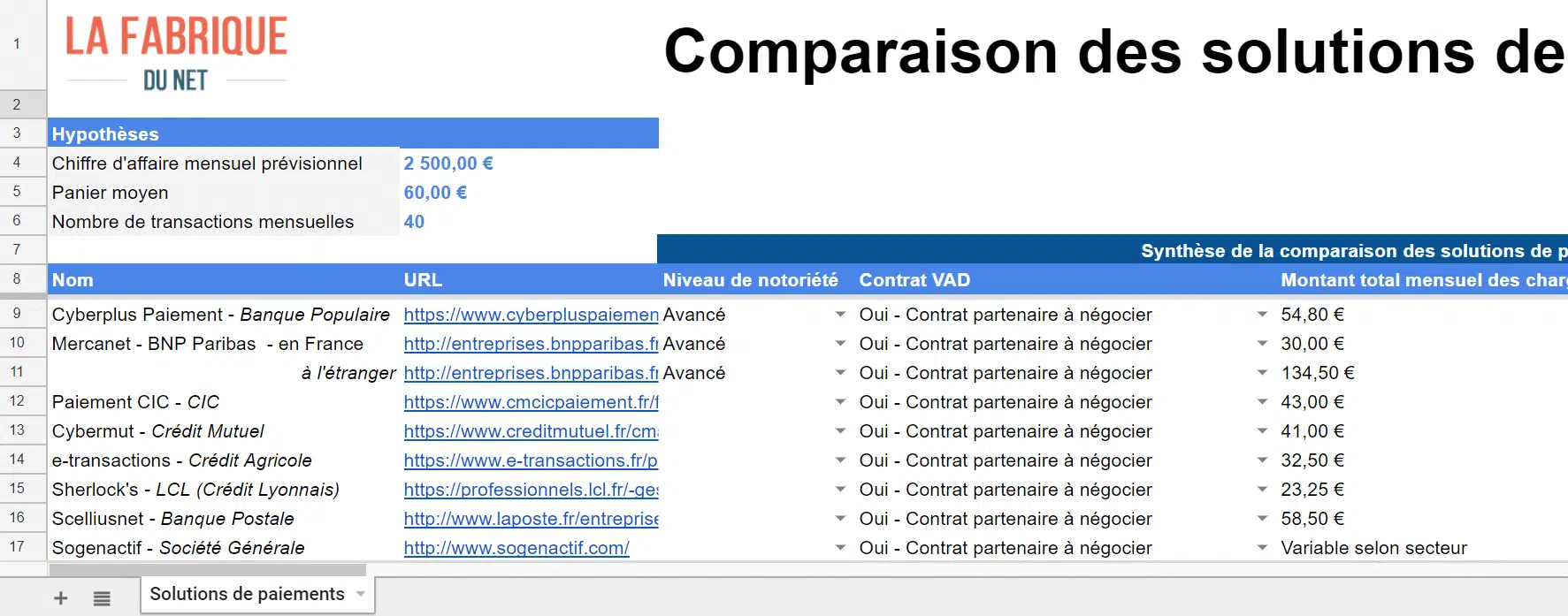 Nous avons conçu spécialement pour vous un tableau complet de comparaison des solutions de paiement en ligne. Ce tableau compare plus de 20 solutions sur une vingtaine de critères répartis en plusieurs catégories : Paramètre des charges bancaires, Fonctionnalités de paiement, Sécurité, Performance technique…Surtout, vous pouvez personnaliser vos hypothèses pour obtenir le coût de la solution de paiement en fonction de trois critères : votre chiffre d’affaires prévisionnel, votre panier moyen et le nombre de transaction mensuel. Ce tableau, au format Google Sheet, est téléchargeable gratuitement. Nous vous invitons vivement à le télécharger et à l’utiliser.