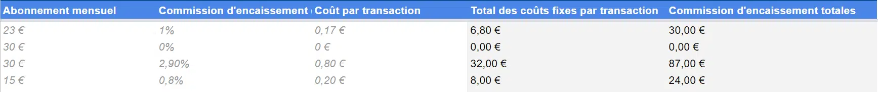 Ce tableau vous permet d’obtenir en un coup d’oeil le coût mensuel de plus de 20 solutions de paiement en ligne sur la base de vos hypothèses économiques.
