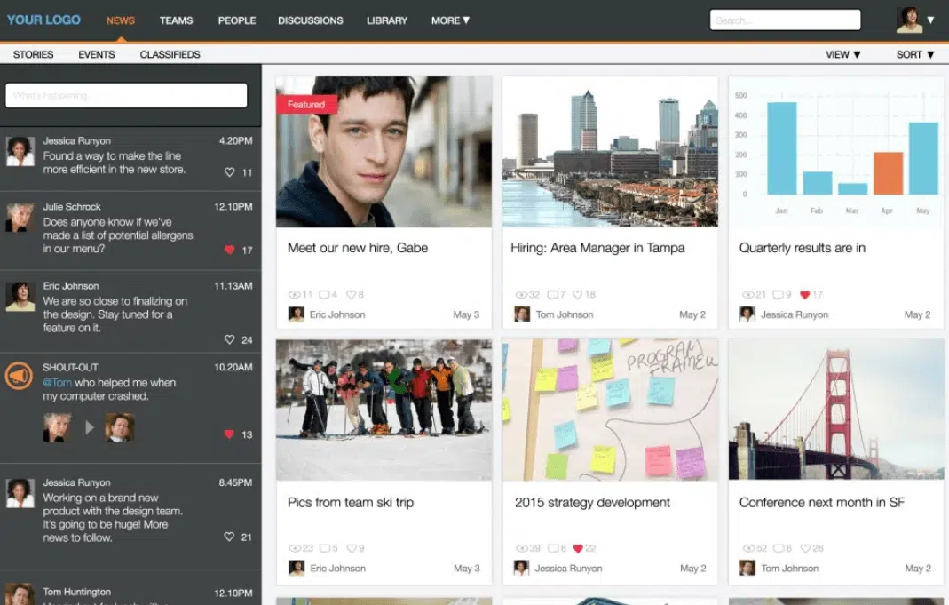Implanté à Vancouver, Jostle a lancé en 2009 une plateforme intranet SaaS (Cloud) pour améliorer la communication interne entre les équipes et l’engagement des salariés. C’est une solution de référence outre-atlantique, mais également utilisé partout dans le monde. Selon l’éditeur, le taux d’utilisation de la plateforme par les employés est de 85%, soit 5 fois plus que les autres intranets. La raison ? L’expérience utilisateur, liée à la simplicité de l’interface et à la richesse fonctionnelle. Les utilisateurs peuvent accéder en quelques clics aux actualités de l’entreprise, aux plannings,, aux événements.