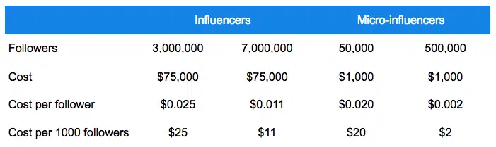 Traditionnellement, les marques regardent la portée potentielle d’un post sur un réseau donné pour déterminer le montant à payer pour une publicité. Par conséquent, le nombre de followers d’un influenceur est devenu une considération pour décider combien le payer. L’idée est que plus un influenceur a de followers, plus la marque peut atteindre de personnes. Ainsi, les influenceurs dont le nombre de membres est plus important facturent généralement plus. Selon le rapport sur l’état du marketing des influenceurs de Digiday, «Le nombre de followers est toujours la référence en matière d’influence». Mais comme il est possible pour les gens d’acheter de faux abonnés pour augmenter le nombre de followers, les marques examinent également d’autres indicateurs pour évaluer leur campagne de marketing d’influence.