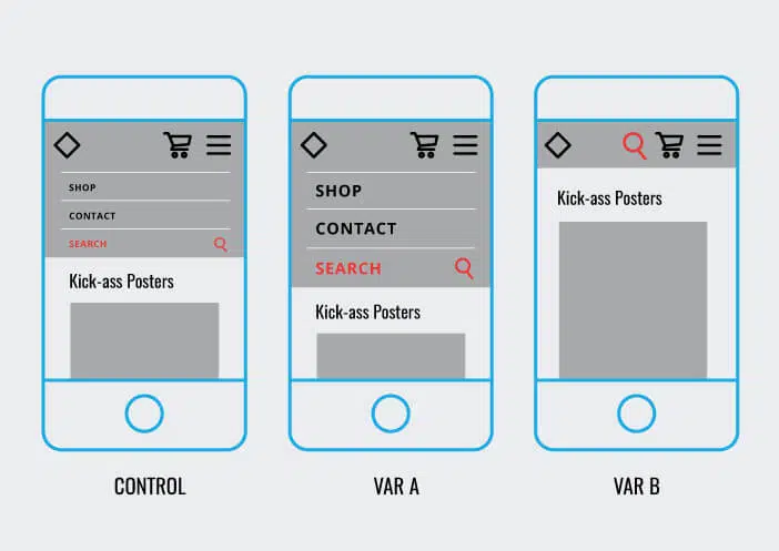 Mais surtout, vous devez tester plusieurs variantes de votre système de navigation, en utilisant des solutions d’A/B Testing modernes et intégrées à vos outils d’analyse UX. Vous pouvez par exemple jouer sur la taille des éléments de navigation (taille des icônes et taille des polices). Vous pouvez aussi réduire au minimum les éléments textes en mettant en place un système de recherches à base d’icônes. Modifiez l’emplacement des éléments et étudiez le comportement de vos utilisateurs vis-à-vis de ces variations pour identifier celle qui créé le plus d’engagement et de conversions.