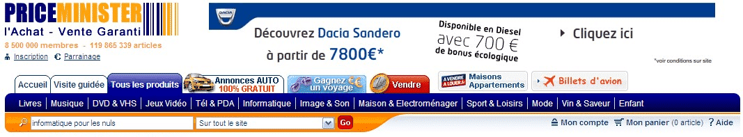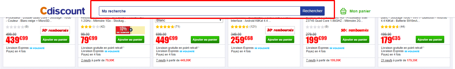 On peut même aller encore plus loin qu’Amazon, Priceminister ou la FNAC et suivre l’exemple de Cdiscount. Cdiscount a mis en place un « sticky header » pour que le moteur de recherche soit toujours en haut de la page, même sous la ligne de flottaison. De cette manière, le champ de recherche reste immédiatement accessible pour l’utilisateur même lorsque celui-ci scrolle la page. C’est très pratique.