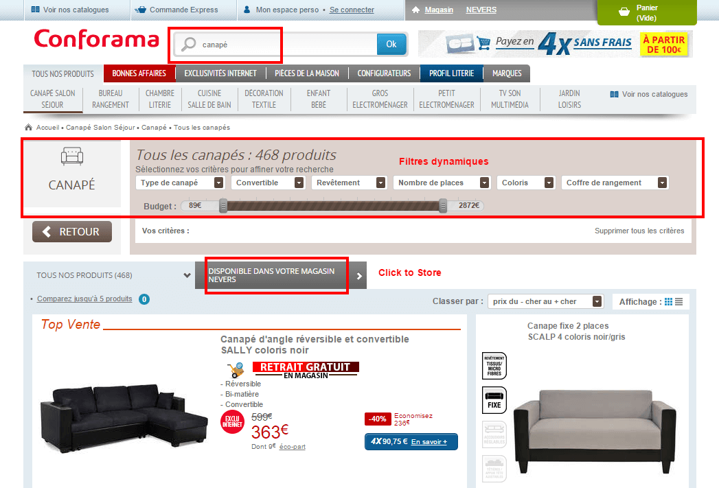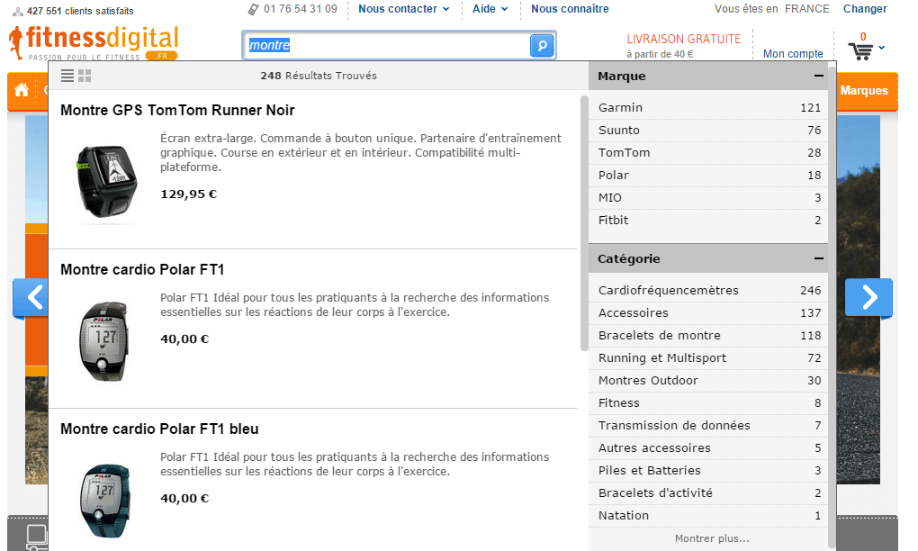 Conforama a réalisé un travail assez remarquable dans la gestion des filtres dynamiques. Les filtres dynamiques permettent de sélectionner les caractéristiques du produit recherché avant même de lancer la recherche. Si vous tapez « canapé » dans le moteur de Conforama, une barre de filtres apparaît et vous demande quel type de canapé vous souhaitez. Le site vous présente aussi des premiers résultats très visibles et avec beaucoup d’infos, comme sur le site Fitness Digital. Cette technologie, qui suppose un gros travail de personnalisation et de travail sur vos données, est un vrai atout pour améliorer la navigation et in fine le taux de conversion de vos visites.