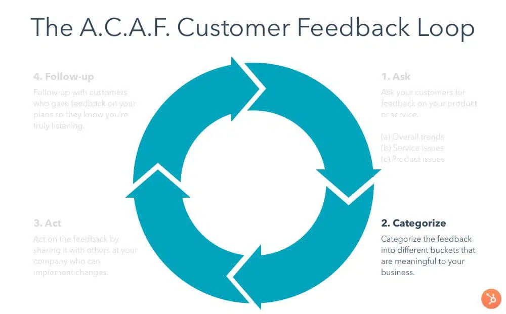 Pour bien organiser votre collecte et votre analyse des feedbacks utilisateurs, nous vous recommandons la démarche mise en place par HubSpot. Dans sa démarche de gestion des feedbacks, HubSpot utilise une boucle constituée de quatre étapes : Ask (demander), Categorize (catégoriser, hiérarchiser), Act (agir) et Follow Up (tenir vos utilisateurs informés de vos actions).