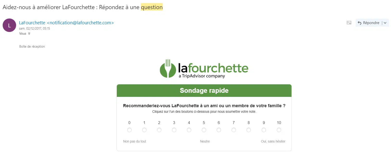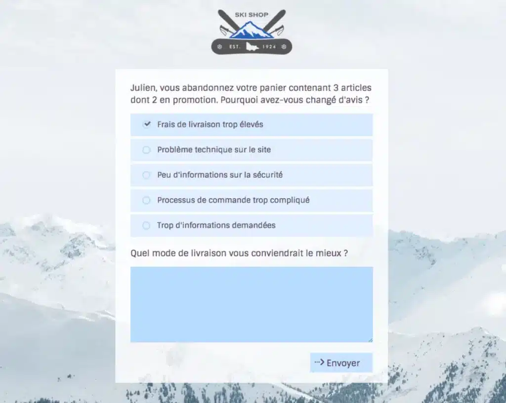 La plupart de ces logiciels permettent de cibler les répondants des questionnaires et le contexte, ce qui permet de poser la bonne question, à la bonne personne et au bon moment. Dans l’exemple ci-dessous, le site affiche le questionnaire « abandon de panier » juste après qu’un utilisateur ait…abandonné son panier. La contextualisation des questionnaires est très importante pour obtenir des feedbacks de qualité. Cela permet d’obtenir des réponses qualifiées à des questions très spécifiques. Si vous observez par exemple un taux de rebond important sur une page stratégique de votre site, pourquoi ne pas créer un questionnaire qui se déclenche lorsque l’utilisateur s’apprête à fermer la fenêtre (on parle d’exit popups), questionnaire dans lequel vous lui demandez ce qu’il pense de la page et les raisons pour lesquelles il s’apprête à quitter le site ? Vous pouvez aussi diffuser vos questionnaires par email ou via des notifications in-app, en utilisant des outils qui facilitent la collecte du Net Promoter Score (NPS), une pratique toujours répandue, ou du Customer Effort Score (CES), de plus en plus utilisé pour mesurer la facilité d’utilisation perçue.