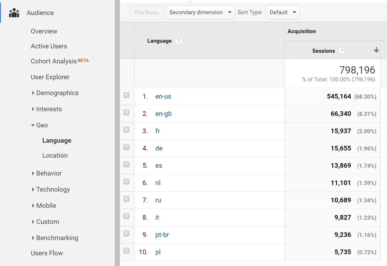 Vous vous demandez peut-être si vous avez réellement besoin d’un site multilingue ? La première chose à faire est de vérifier si vous avez déjà du trafic international. Nous vous recommandons de consulter Google Analytics. La première place est «Audience → Géo → Langue». Google Analytics utilise ces données des navigateurs web de vos visiteurs.