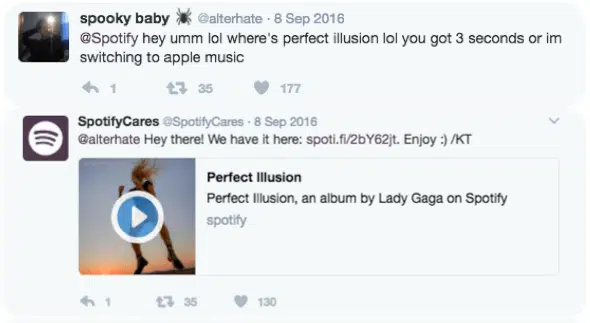 Si le client qui a laissé la mention ou l’avis négatif est vraiment contrarié, il est nécessaire de s’excuser, peu importe à quel point le client est mauvais ou désagréable. Dire que vous êtes désolé nécessite d’avoir un réel processus. Agissez poliment et humblement quoi qu’il arrive. Toutefois, si le client présente le cas au public et que vous pouvez prouver que cela est faux, faites de votre mieux pour corriger les faits. Dans l’exemple ci-dessous, une internaute se demande pourquoi il n’y a pas le titre de Lady Gaga « Perfect illusion » sur Spotify alors que, bien-sûr, il est présent.