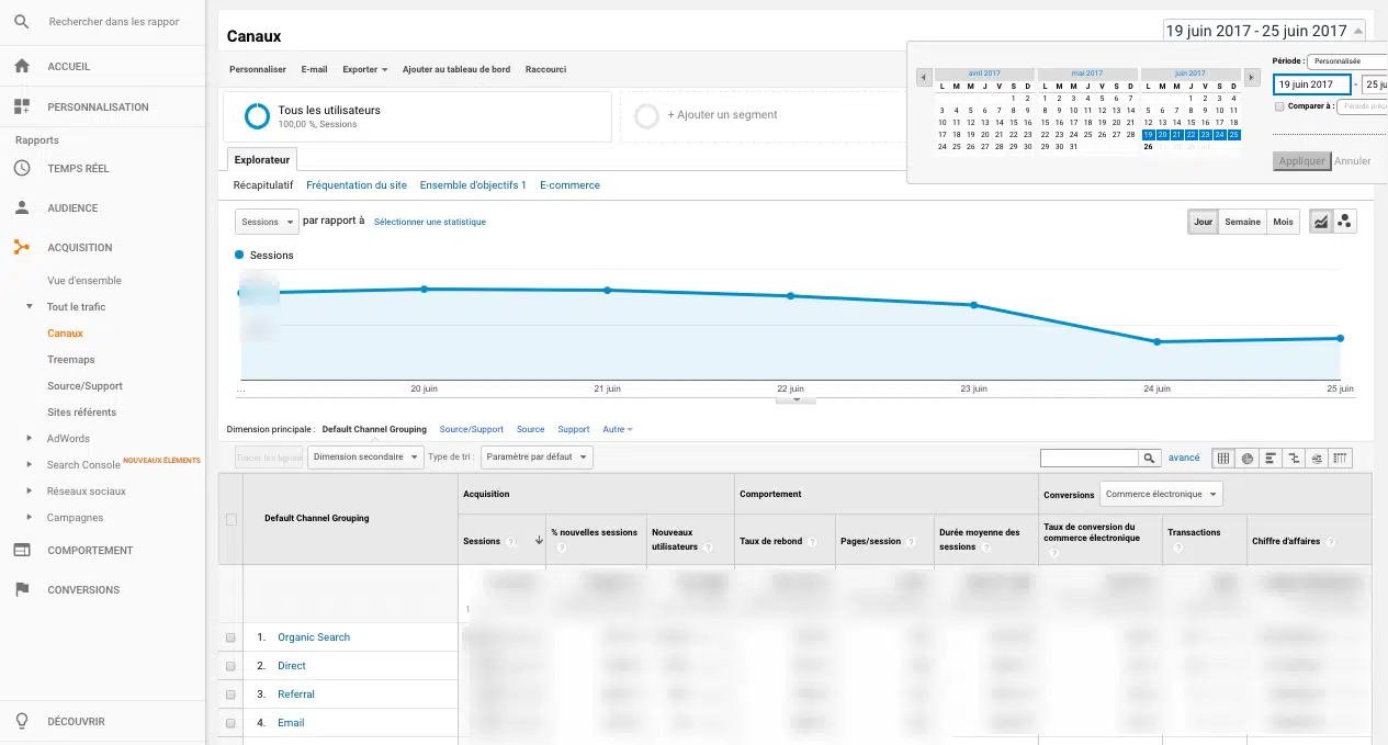 Un site web performant, c’est un site web qui génère beaucoup de trafic et qui a un bon taux de conversion. Google Analytics de comparer l’évolution de votre trafic au cours du temps dans Acquisition ==> Tout le trafic ==> Canaux. Cela donne une bonne indication de la croissance de votre activité web.