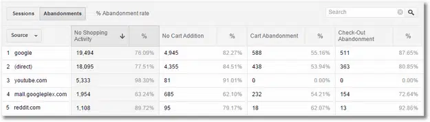 Le rapport ci-dessus permet de voir que sur les 173 230 sessions, 29 198 aboutissent à la consultation d’une fiche produit, 5 361 à un ajout panier, 3 000 à un départ du site en cours de commande, et 550 à une transaction. Autrement dit, sur 173 230, seulement 550 aboutissent à un achat. Ce qui est très faible en l’occurrence. Vous êtes également confronté à cette situation ? Nous vous conseillons dans ce cas de créer des segments personnalisés pour mieux comprendre les raisons de ce faible taux de conversion. Par exemple un rapport qui affiche les consultations de fiches produits en fonction de la source de trafic. L’idée est d’analyser le comportement des différents segments de visiteurs pour identifier ceux qui posent problème.