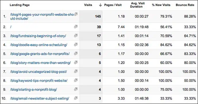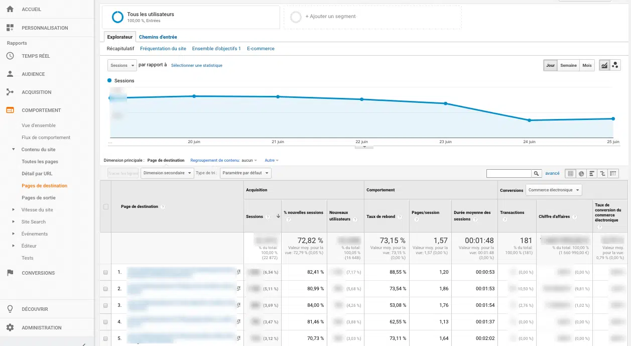 Les rapports « Pages de destination » sont très utiles car ils se concentrent sur vos pages stratégiques, celles qui drainent le plus de trafic sur votre site. Ce sont les pages qui créent la première impression de vos visiteurs sur votre site. Optimiser les landing pages doit être une de vos grandes priorités. Si vous avez une excellente page d’accueil, c’est très bien, mais si l’essentiel de vos visiteurs découvrent votre site en arrivant sur le blog, vous devez concentrer vos efforts sur le blog, en mettant en place une stratégie marketing permettant d’améliorer la conversion des personnes qui arrivent sur le site depuis ce point d’entrée.