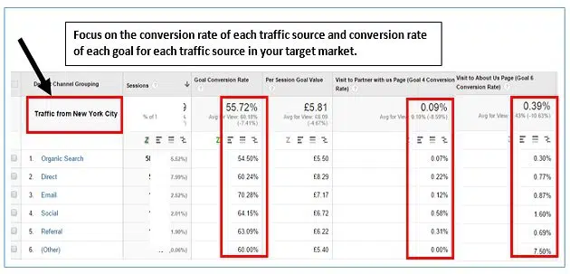 Intéressez-vous aussi à la variation de votre taux de conversion en fonction de la zone géographique de votre audience et du type d’audience. Vous apprendrez surement des choses intéressantes. Dans cet exemple, nous analysons le taux de conversion pour les différents objectifs du site de l’audience new-yorkaise. Si vous vendez sur un marché local et que le référencement local a du sens pour vous, ce type d’analyse est très important.