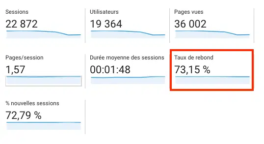 Le taux de rebond est un indicateur très important de la qualité de votre site web et de l’intérêt qu’il suscite auprès des internautes. Plus votre taux de rebond est faible, mieux c’est. Avoir un taux de rebond bas signifie que vos utilisateurs sont satisfaits par vos contenus. Toutefois, le taux de rebond – comme beaucoup d’indicateurs – a ses limites. Un visiteur qui ne consulte qu’une seule page de votre site n’est pas forcément un visiteur insatisfait par vos contenus. La page visitée est peut-être une page très riche et très qualitative au niveau du contenu. Le visiteur y a peut-être passé 8 minutes dessus ! A l’inverse, un visiteur peut ouvrir 5 pages de votre site en 1 minute et quitter le site furieux de n’avoir pas trouvé ce qu’il cherchait et d’avoir cliqué sur le mauvais lien dans Google. Il faut toujours être prudent dans l’interprétation du taux de rebond.
