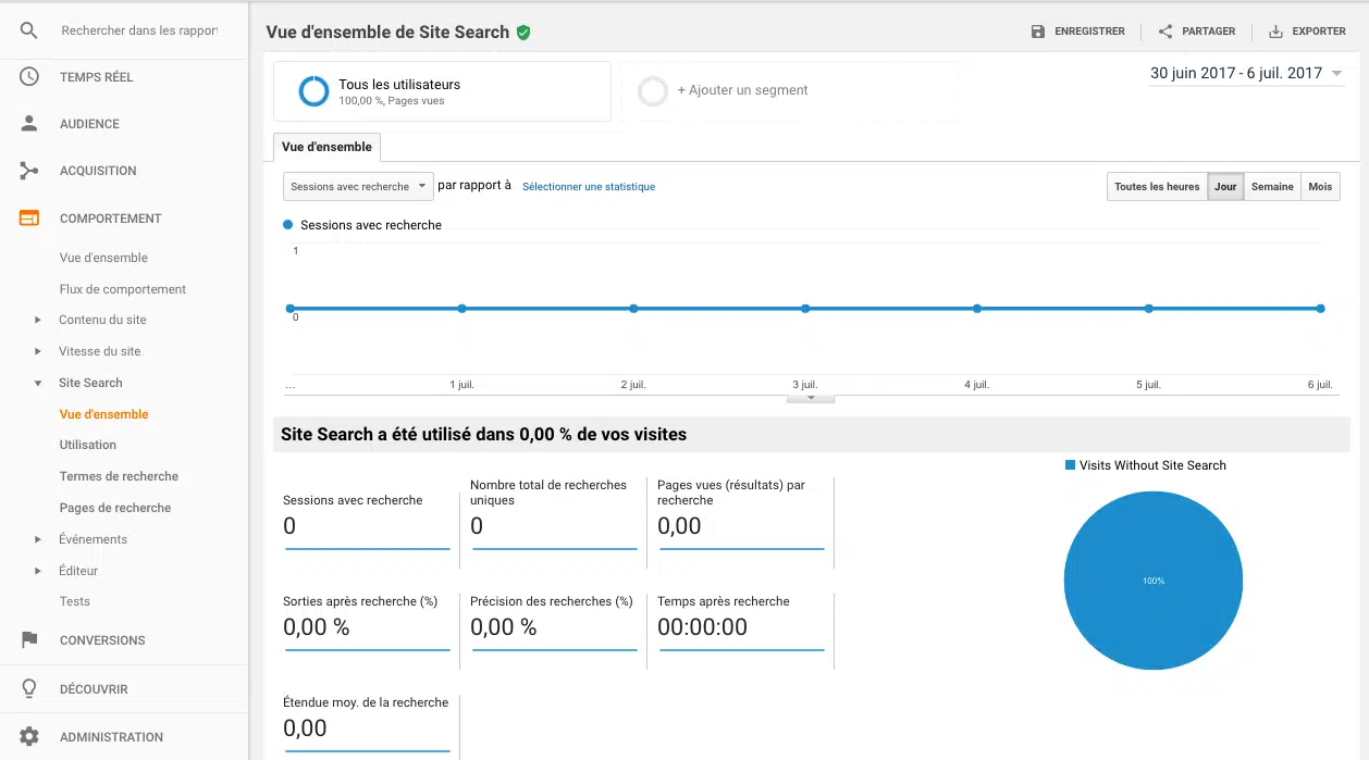 S’il est important de comprendre comment vos visiteurs accèdent à votre site web, il est très intéressant aussi d’analyser la manière dont ils naviguent à l’intérieur de votre site, comment ils se comportent sur votre site. Pour cela, rendez-vous dans Comportement ==> Site Search ==> Vue d’ensemble. Au départ, vous atterrirez surement sur un rapport sans data :