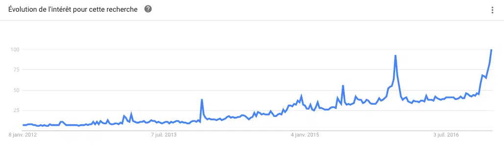 L’huile de coco fait fureur. Nous avons découvert cette tendance grâce à Google Trends. La progression de la popularité de ce produit est constante. Cette huile végétale est utilisée comme soin nourrissant pour les cheveux et la peau (monoï), mais aussi comme dentifrice, crème à raser. Ses usages sont de plus en plus nombreux. L’huile de coco serait dotée de propriétés magiques, permettrait d’améliorer son sommeil mais aussi de prévenir la maladie d’Alzheimer !