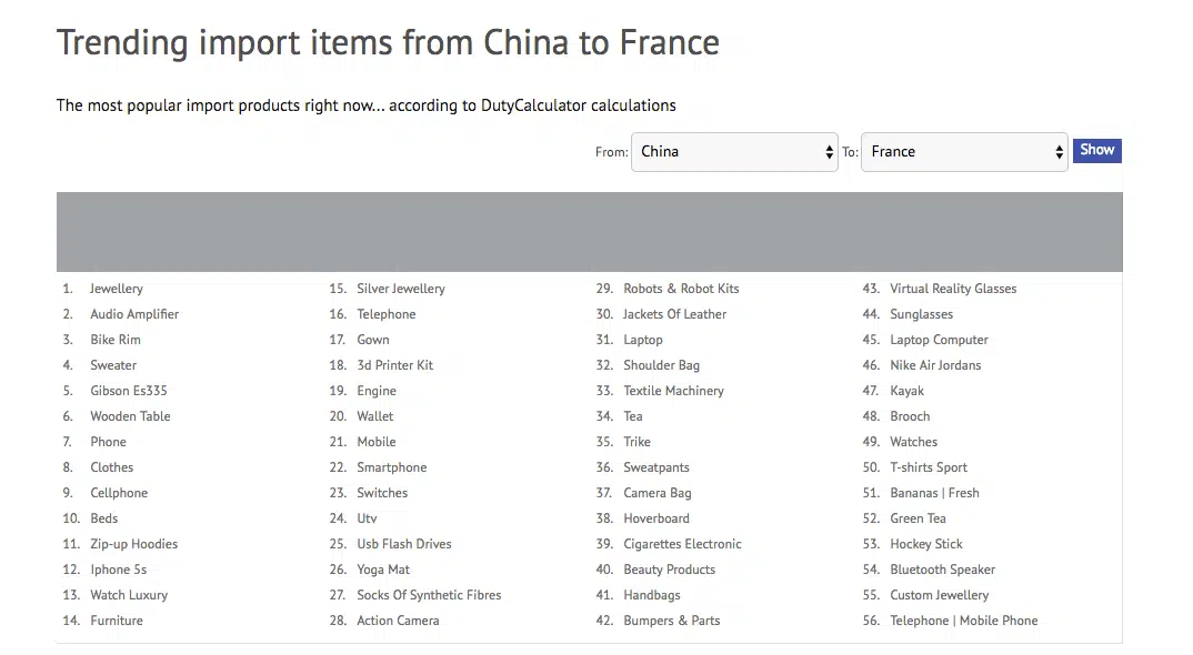 Pour finir en beauté, voici une dernière technique pour trouver des produits à fort potentiel. Il existe des outils spécialisés pour suivre les tendances en matière d’importation de produits, comme ImportGenius ou Panjiva, qui permettent d’analyser les flux d’importation et d’exportation à l’échelle mondiale. Vous pouvez découvrir les flux d’importation en provenance de n’importe quel pays, la Chine par exemple, et à destination de n’importe quel pays, la France par exemple. C’est une bonne technique pour savoir ce que les vendeurs achètent, et donc ce qui se vend au moment où vous faites la recherche.