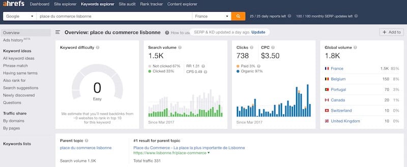 Je consulte d’abord tous les monuments, jardins ou activités touristiques disponibles à Lisbonne. Muni d’outils d’analyse SEO avancés comme Ahrefs, Semrush ou Sistrix, j’effectue des recherches sur les lieux relevés précédemment.