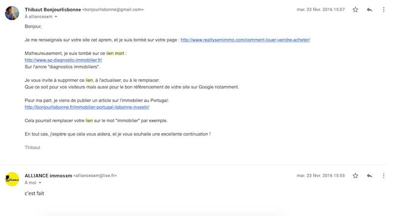 Je contacte les sites qui possèdent des liens morts (ainsi que ceux qui linkent vers ces liens morts) et je leur propose de remplacer ces liens par les miens. Pas besoin que les liens soient parfaitement cohérents avec ceux à remplacer, comme je le montre avec la capture d’écran ci-dessous.