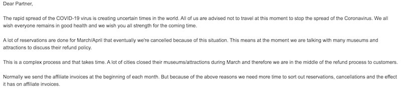 En effet, lors de la pandémie de coronavirus, les frontières se ferment une par une. L’Italie fait partie des pays les plus touchés. Les magasins ferment, les lieux touristiques aussi et les clients annulent un par un leur voyage. Le tourisme est alors au point mort. Mes partenaires ne connaissent aucune rentrée d’argent et doivent également reporter leur paiement.