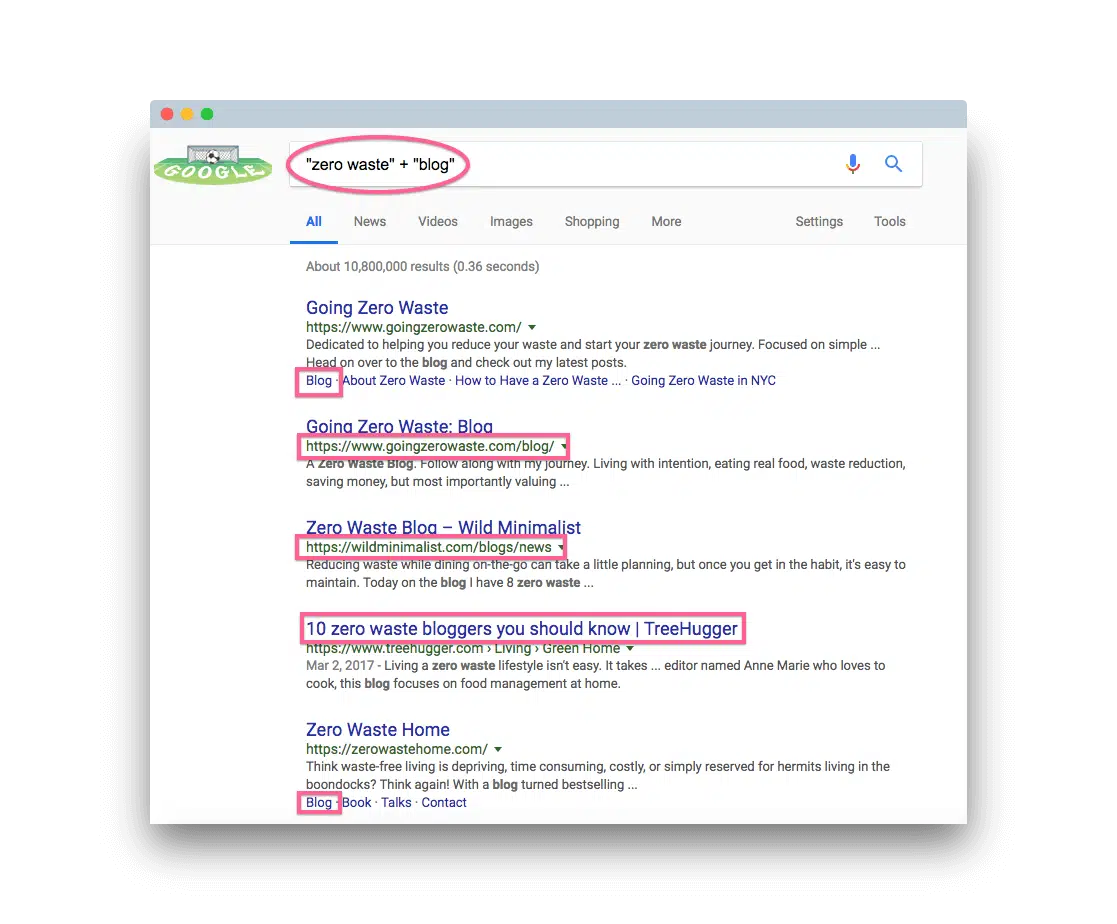 Il est probable que vous ayez déjà une bonne idée de qui sont les blogueurs populaires et les influenceurs dans votre secteur, sinon, vous pouvez les trouver en utilisant Google. Par exemple, si votre magasin a vendu du dentifrice sans emballage, cela peut supposer que votre client idéal pourrait être intéressé par un style de vie zéro déchet. Comme il y a beaucoup de blogs dédiés à la réduction des déchets, leur public serait probablement intéressé par votre produit. Pour trouver des blogueurs qui promeuvent un style de vie zéro déchet, vous devez faire une recherche Google pour « zéro déchet » + « blog ». L’utilisation de guillemets et d’un signe « + » aidera à trouver des résultats de recherche pertinents des blogs qui, espérons-le, ne sont pas vos concurrents.