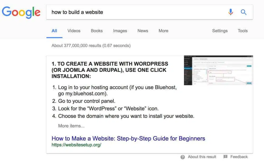 Maintenant que vous avez vos mots-clés, votre prochaine étape consistera à répondre aux questions des utilisateurs de manière aussi complète et détaillée que possible. C’est là que vous vous mettez au défi d’être meilleur que vos concurrents. Regardez de plus près le contenu des sites dans les featured snippets. Votre contenu ne doit pas être très long. Disons que vous voulez écrire un article qui enseigne à votre public à construire leurs propres sites Web. Vous lancez une recherche sur Google et utilisez les termes de recherche « comment construire un site web ». Il y a un article sur le sujet qui se classe en position 0: