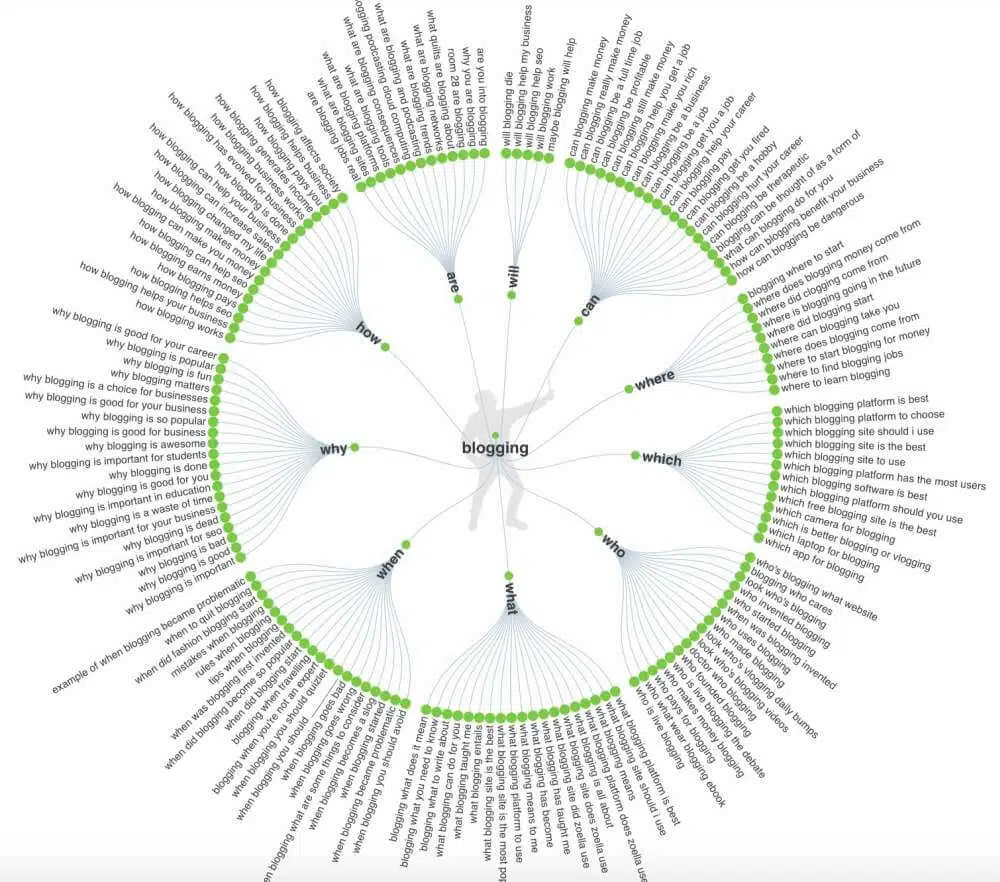 Entrez simplement un terme ou une expression et cliquez sur le bouton de recherche. Dans l’exemple ci-dessus, j’ai entré le mot-clé « blogging ». Voici quelques unes des requêtes que j’ai reçues de cette recherche: