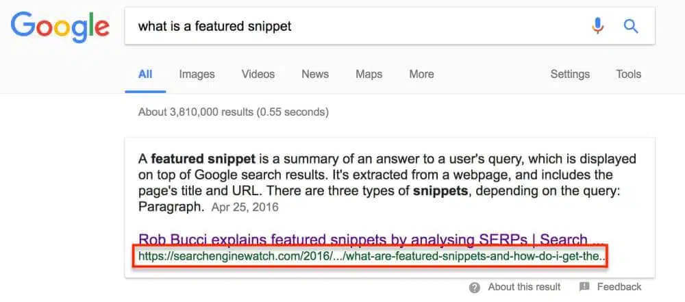 Par exemple, si vous voulez apprendre la manière de planter un arbre ou de faire cuire un œuf, les featured snippets peuvent vous aider. Prenez note que les requêtes simples sont celles qui concernent les calculs, le temps et la météo, et la définition des termes. Google ne prend pas de réponses à ces requêtes provenant de sites tiers et utilise à la place sa propre base de connaissances. Surtout, ne confondez pas une réponse directe (à une requête simple) et un featured snippet. La capture d’écran ci-dessus montre clairement un feature snippet après avoir tapé dans la zone de recherche de Google la requête de recherche « Qu’est-ce qu’un featured snippet. » Comme vous pouvez le voir, un featured snippet affiche la section exacte d’un contenu entier où une personne trouve l’information recherchée. Dans le même temps, Google vous donne le lien vers cette page Web. Il serait utile de penser à des featured snippets sélectionnés comme méthode pour Google afin de fournir des réponses aux internautes d’une manière rapide et concise. Prenez note qu’il y a une grande chance que vous vous classiez en position 0 si votre contenu est déjà sur la première page des SERPs. Basé sur une étude récente menée par Ahrefs, 99,58% des featured snippets sont ceux qui appartiennent déjà au top 10. Donc, si vous êtes en position 10, la position 0 est atteignable. Il est assez évident que le fait d’apparaître dans cette petite case au-dessus de la 1ère positon vous place dans une position favorable par rapport à la concurrence. Cependant, il n’est pas rare d’entendre parler de sites, qui sont à la page 2 de Google, et qui acquièrent cette position très convoitée.
