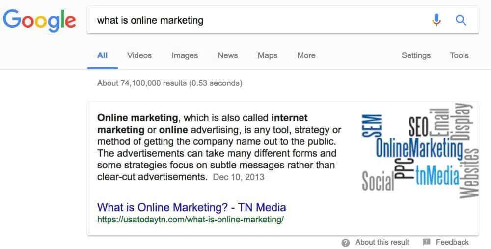 Vous obtenez le type de paragraphe du featured snippet si votre requête peut être résolue en une phrase ou en un paragraphe. Dans l’exemple ci-dessous, je voulais connaître la signification du marketing en ligne. Google m’a montré un snippet sur le sujet qui appartenait à une page Web en position 4: