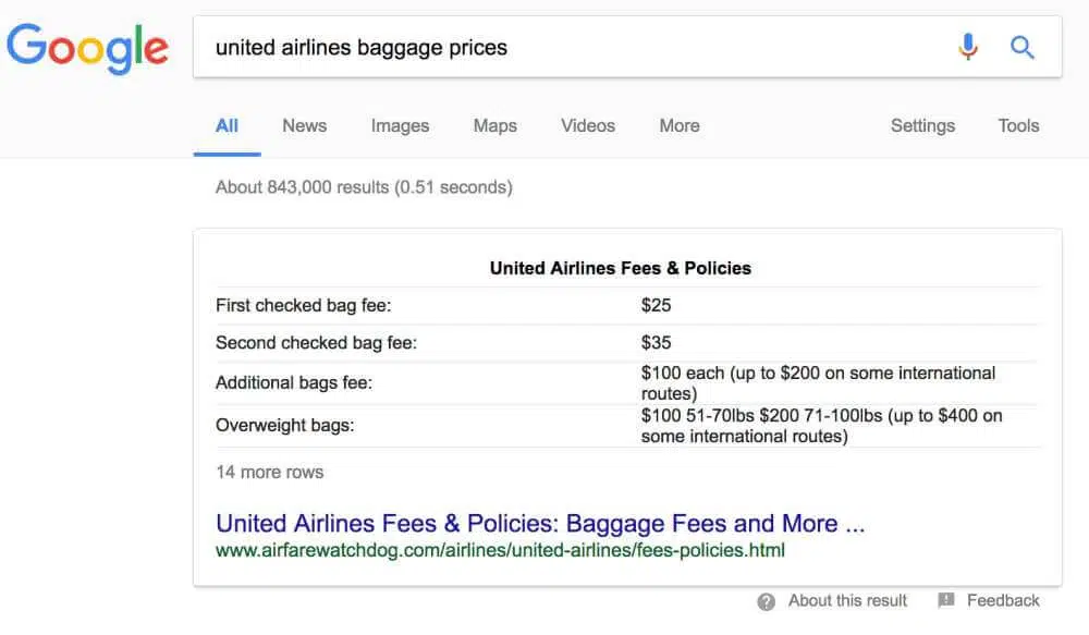Si vous cherchez une comparaison de prix, disons, les prix des bagages pour United Airlines, Google vous montrera un extrait de type de table pour répondre à votre requête: