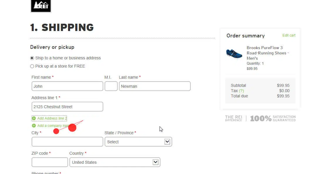 Il a été observé qu’une conception simple peut fonctionner remarquablement bien : la fusion des champs « Adresse Ligne 2 » et « Nom de l’entreprise » derrière un lien texte. Les champs sont ainsi masqués jusqu’à ce que l’utilisateur clique sur le lien correspondant qui à son tour révèle le champ de formulaire. En affichant uniquement « Ligne d’adresse 1 », le formulaire est réduit. Tout aussi important, sur les sites qui ont fourni un lien pour révéler le champ «Ligne d’adresse 2», nos tests de suivi oculaire ont révélé que tous les sujets ont vu les liens avant de passer à autre chose ou de s’engager avec eux.