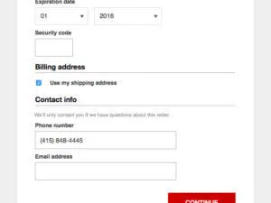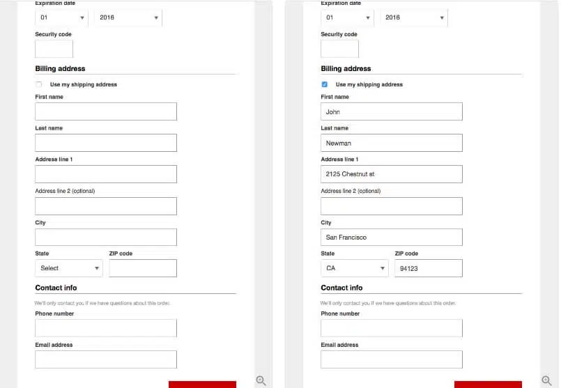 La solution consiste à définir par défaut « Adresse de facturation = adresse de livraison », 14% des sites ne le font toujours pas. Lorsque la case « Adresse de facturation est la même que l’expédition » est cochée, les champs d’adresse de facturation doivent être complètement cachés (plutôt que remplis automatiquement). Pour le flux de paiement moyen, similaire à l’exemple ci-dessus, cette modification seule réduira le nombre de champs affichés par défaut de 37%.