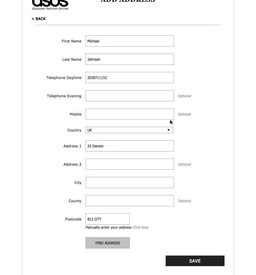Les utilisateurs peuvent très vite être intimidés par les nombreux champs optionnels dans le formulaire d’ASOS. Pourquoi ont-ils besoin de 3 numéros de téléphone différents ? C’est juste un site de vêtement et ces informations sont loins d’être capitales. Simplifiez au maximum vos formulaires.