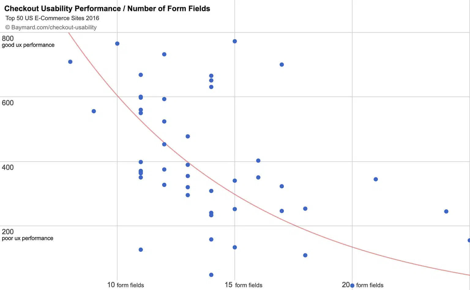 Lorsque nous comparons la performance UX des 50 meilleurs sites de commerce électronique américains par rapport au nombre d’éléments de formulaire dans leur tunnel d’achat, nous constatons qu’il existe une corrélation (la ligne rouge) entre le nombre d’éléments de formulaire affichés par défaut et l’expérience utilisateur globale du tunnel d’achat. Plus précisément, l’indice de référence révèle que le flux de paiement moyen contient 23,48 éléments de formulaire et 14,88 champs de formulaire (lors de l’achat en tant que nouveau client sans compte). Pourtant, un flux de paiement entièrement optimisé peut être seulement de 7 champs, avec un total de seulement 12 éléments de formulaire.
