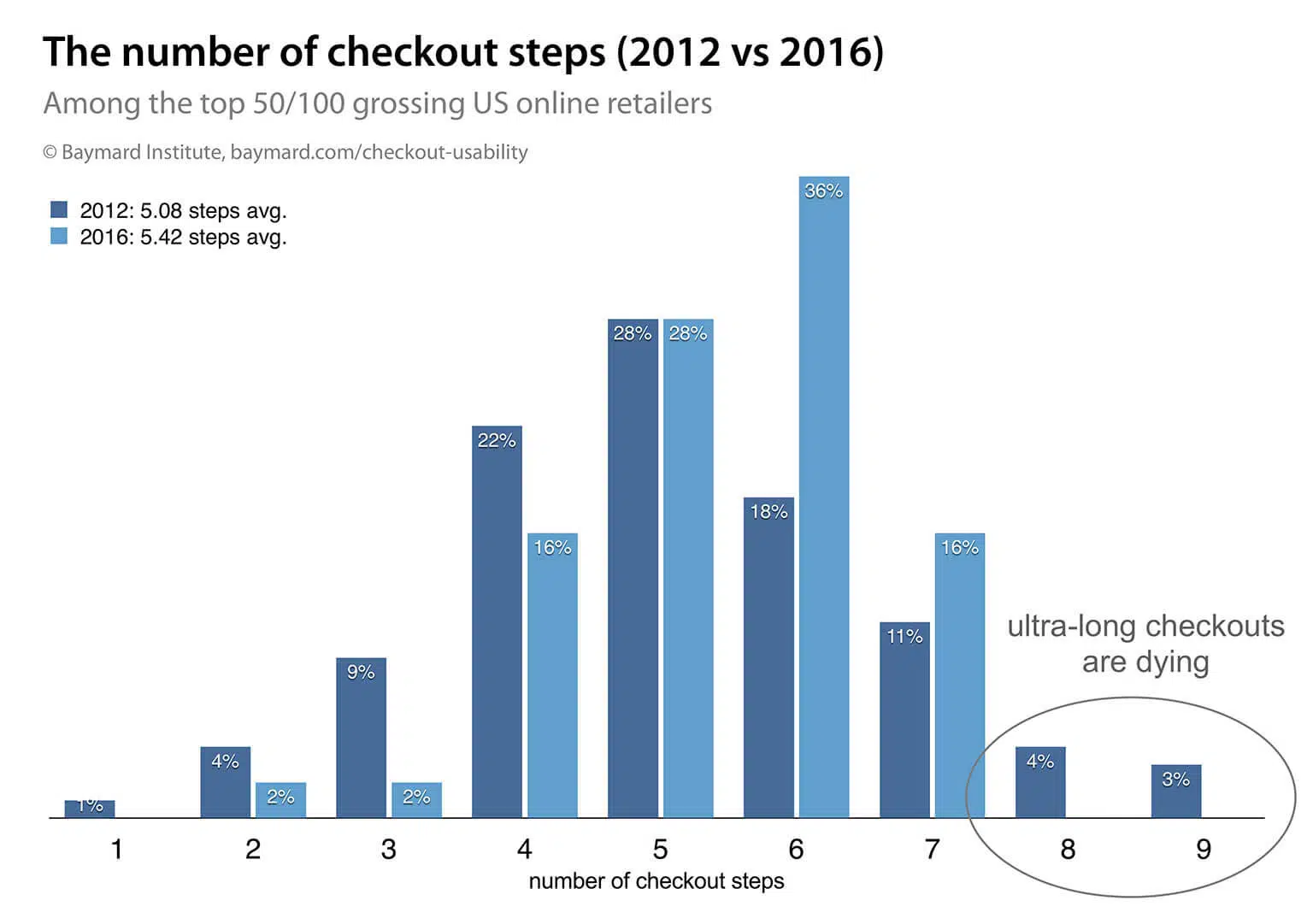 Si vous mettez la performance UX de côté, et juste en regardant le nombre d’étapes jusqu’au paiement, les 50 premiers sites de commerce électronique américains révèle que le flux de paiement moyen pour un nouvel utilisateur comporte généralement entre 4 et 6 étapes, mais la tendance actuelle privilégie la flexibilité et l’adaptation dynamique du parcours selon le profil et le contexte de l’utilisateur.