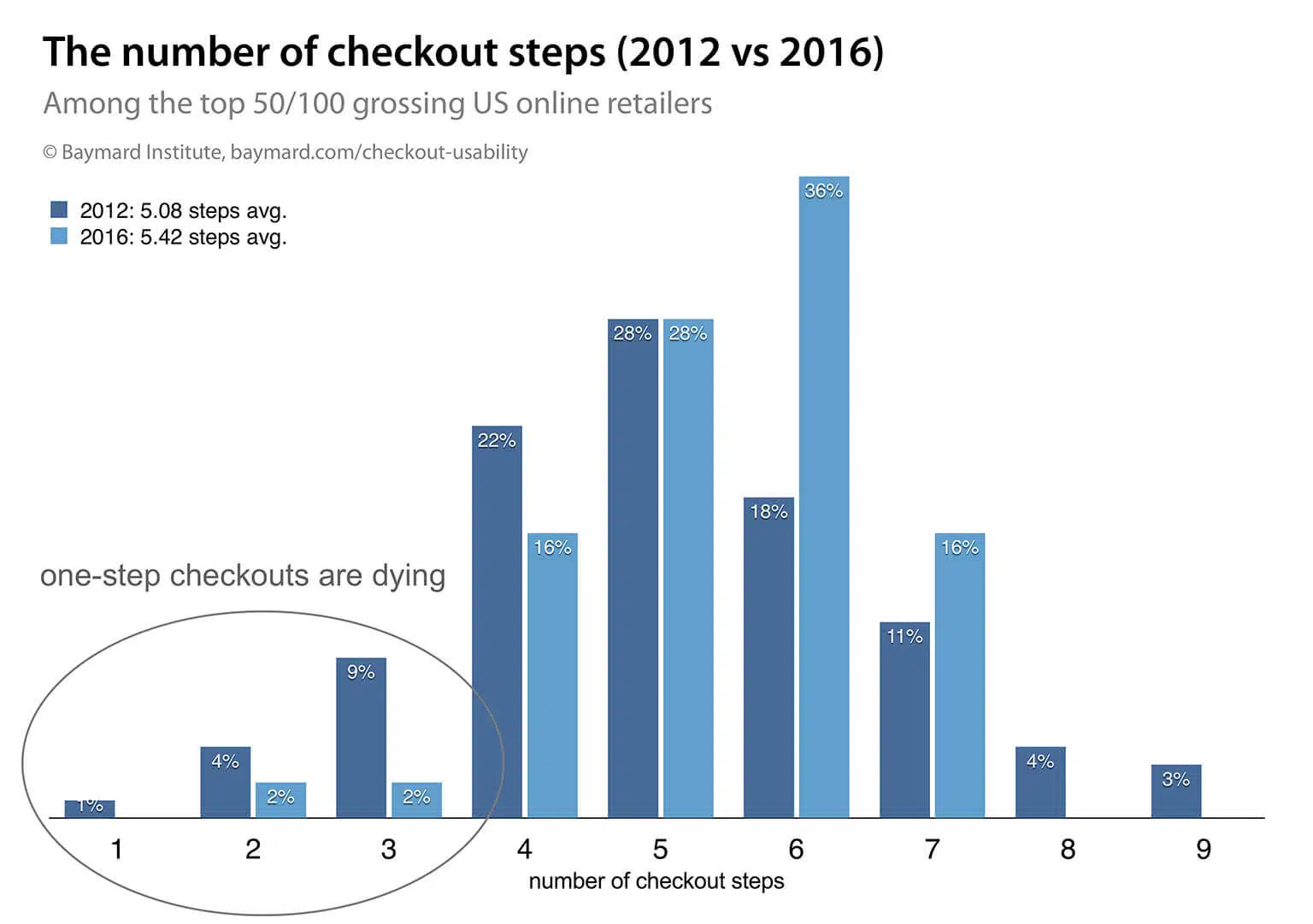 Il est intéressant de voir que le processus a augmenté en longueur – passant de 5,08 étapes en 2012 à 5,42 en 2016. Bien que cela puisse sembler contre-intuitif, nous constatons régulièrement lors de test de l’utilisateur final et du benchmarking que le nombre d’étapes n’est pas l’aspect le plus important dans l’expérience de paiement de l’utilisateur. C’est plutôt ce que l’utilisateur doit faire lors de ces étapes qui est important.