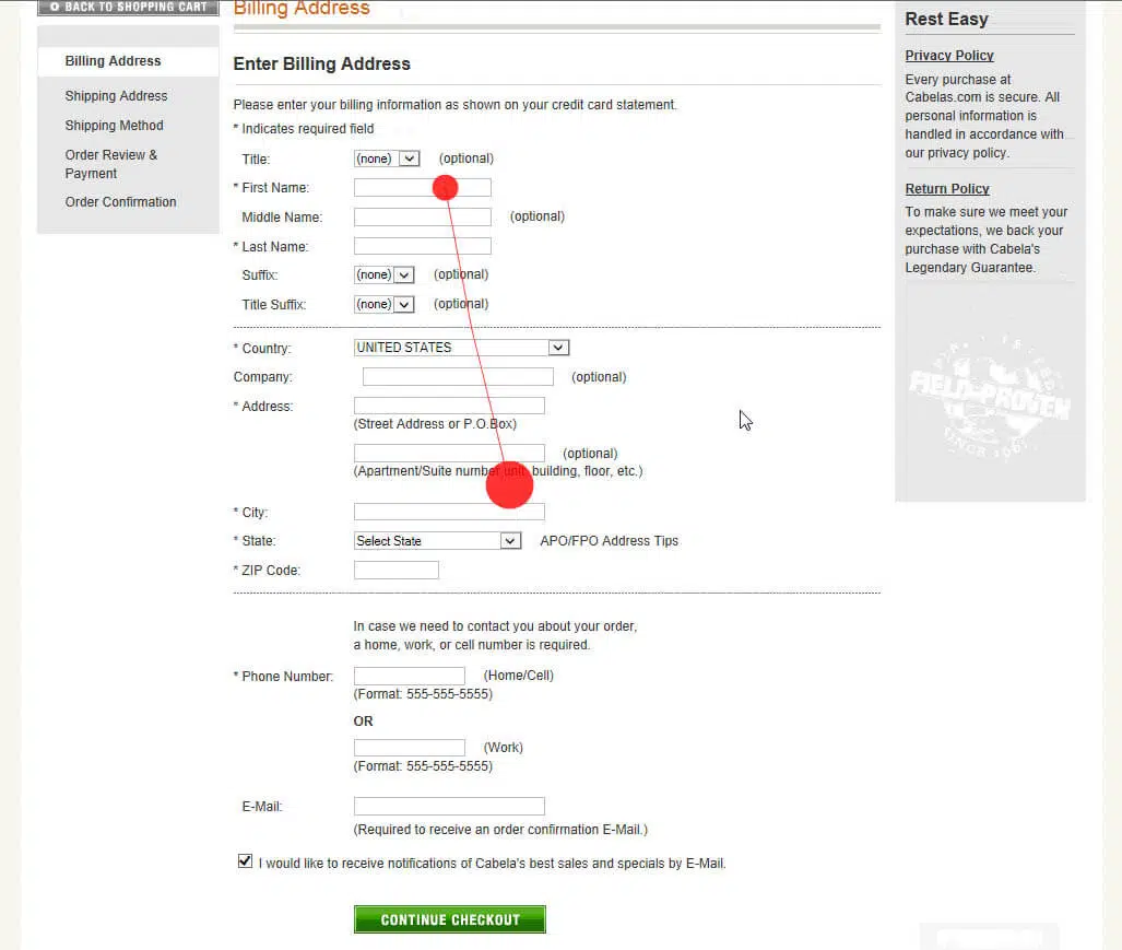 Lors des tests, nous observons systématiquement que les utilisateurs sont submergés et intimidés lorsqu’ils voient une grande quantité de champs de formulaire à remplir. Lorsque vous travaillez sur la simplification des formulaires, il est important de se rappeler que même les champs optionnels ajoutent de la friction au flux de paiement. S’il est vrai que les utilisateurs n’ont pas besoin de remplir les champs facultatifs, ils ne le réaliseront pas avant d’avoir accédé à ces champs et de voir le libellé « facultatif ». Ainsi, lorsque les utilisateurs regardent d’abord la page, les champs optionnels sont aussi intimidants que les champs requis (parce que l’utilisateur n’a pas encore distingué les deux), et peuvent donc faire paraître une étape plus compliquée qu’elle ne l’est réellement. Jetons un coup d’œil à quelques exemples: