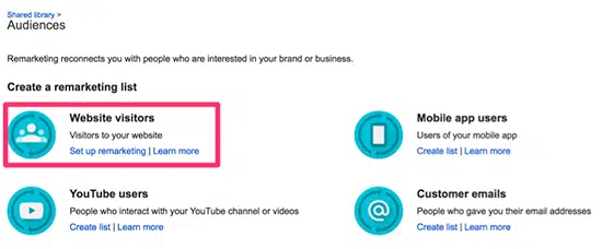 Pour commencer le retargeting sur AdWords, accédez à Campagnes> Bibliothèque partagée, puis sélectionnez « Audiences ». Vous serez confronté à quatre choix. Pour cibler de nouveau les internautes ayant visité votre site web, sélectionnez « Visiteurs du site web ».