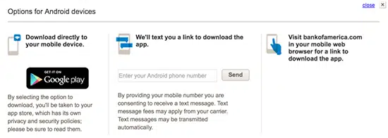 C’est de loin l’une de nos méthodes préférées pour transformer les visiteurs de bureau en utilisateurs d’applications. Cette méthode est simple et pratique pour le client. Plus important encore, les textos sont rarement oubliés ou ignorés. Les SMS marketing continuent d’afficher des taux d’ouverture très élevés, nettement supérieurs à ceux des emails marketing. Bank of America offre aux clients la possibilité de recevoir un texto avec un lien vers l’application (en plus du lien obligatoire vers l’App Store). Pour accéder à ces options à partir de cette page, les clients doivent commencer par cliquer sur « Obtenir l’application sécurisée ». Cela active un menu déroulant qui leur demande de sélectionner leur appareil. De là, un écran ressemblant à ceci s’affichera :