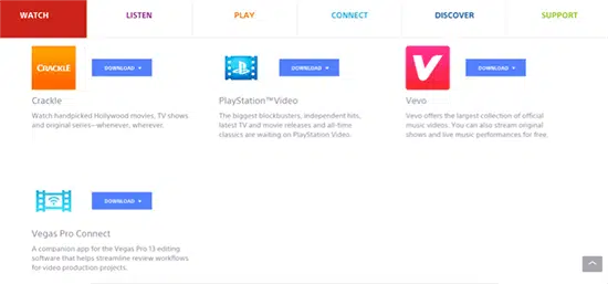 Voici un exemple de comment Sony fait cela. Sony offre une gamme d’applications, et chacune est résumée en utilisant son nom, son logo et une brève présentation. Lorsque vous cliquez dessus, les boutons « télécharger » révèlent un menu déroulant avec un lien vers l’emplacement où cette application peut être trouvée dans chacun des stores.