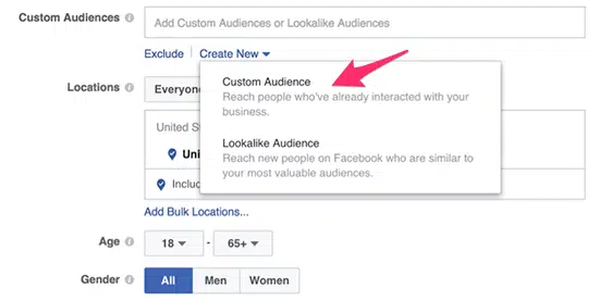 Sur les publicités Facebook, vous pouvez recibler en téléchargeant une audience personnalisée de numéros de téléphone ou d’adresses e-mail ou en ajoutant un pixel sur votre site. Ce pixel permettra de tracker et retargeter les personnes qui ont visité votre site. Dans ce cas, la première étape consiste à sélectionner « Créer nouveau » dans la section « Audience » de votre ensemble d’annonces, puis à choisir « Audience personnalisée ».