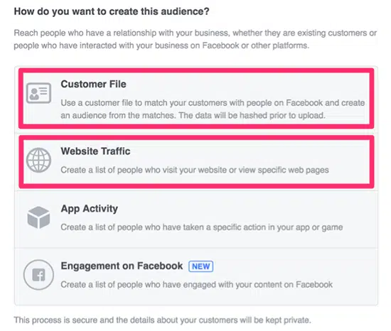 De là, vous devrez choisir soit « Fichier client » (pour ajouter les numéros de téléphone des clients ou les adresses e-mail) ou « Trafic du site Web » (pour recibler les personnes qui ont visité votre site).